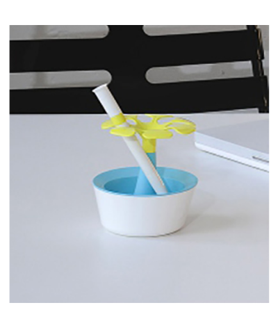 Pot à crayon avec support en forme de fleur. La fleur est interchangeable. Fabriqué en France. Coloris standard : socle et bouchon du stylo. Coloris pantone disponible sur demande à partir de 50... Suite dans la description