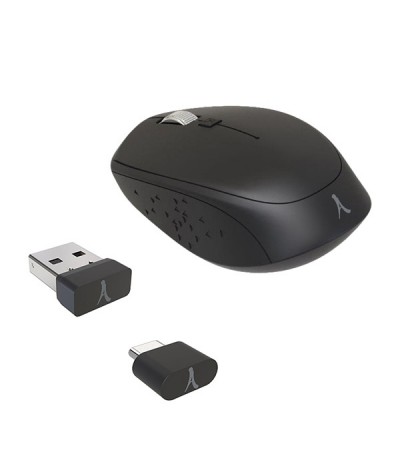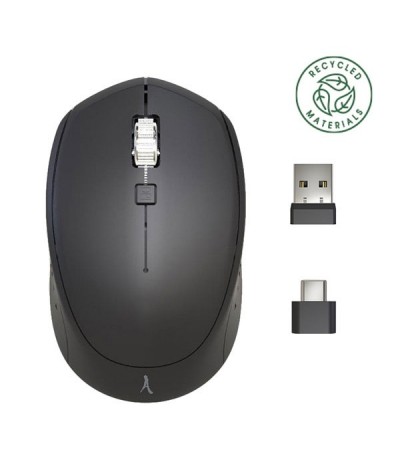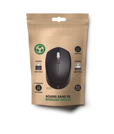 Souris sans fil en plastique recyclé et packaging éco-conçu. 3 boutons 800-1200-1600 DPI Mode veille après 15s, veille profonde 15' 1 pile AA = 4 mois d'autonomie Compatible Windows, Mac,... Suite dans la description