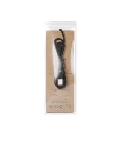 Le câble est constitué de matériaux écologiques : bois certifié FSC et cordons issus de bouteilles recyclées (rPET).