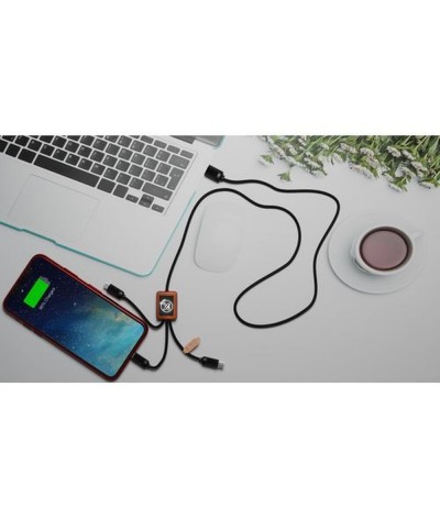 Câble 3-en-1 de 1 mêtre en bambou FSC et cordons rPET Câble 3-in-1 d'une longueur de 1 mètre avec logo lumineux et multi-connecteur (Type C, Micro USB, iPhone). Le câble peut charger 2 à 3... Suite dans la description
