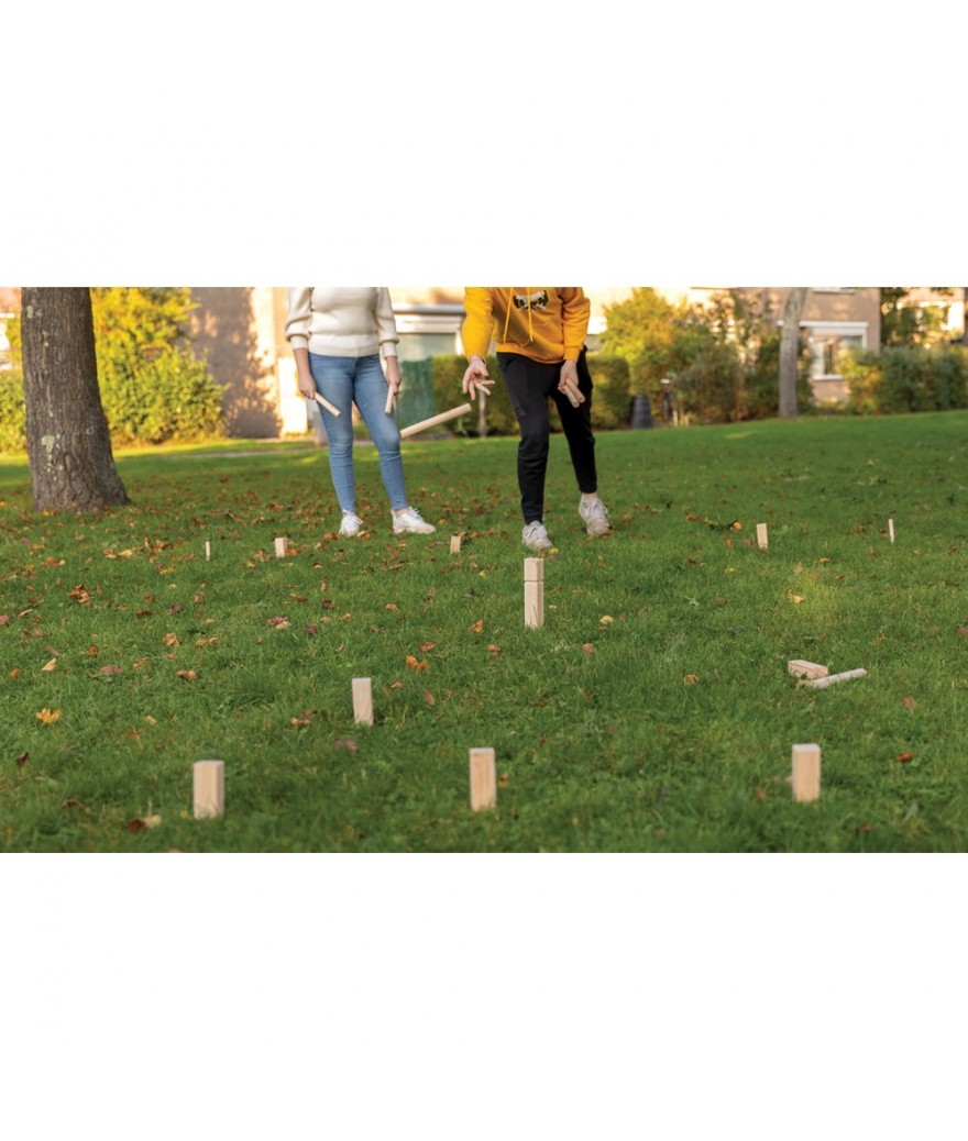Le Kubb est à l'origine un jeu de lancer suédois, mais il est rapidement devenu populaire et connu dans le monde entier. Une façon idéale de passer un après-midi d'été entre amis. L'objectif est de faire tomber les chevaliers des autres équipes en lançant les bâtons circulaires à quelques mètres de distance. Utilisez les poteaux d'angle en bois pour délimiter votre terrain de jeu et les parties peuvent commencer ! L'ensemble comprend 1 roi, 6 bâtons de lancer, 10 chevaliers et 4 poteaux d'angle. Fabriqué en bois de pin (roi et chevaliers) et en bois d'eucalyptus (bâtons de lancer et poteaux d'angle). Pochette en coton et règles du jeu incluses.