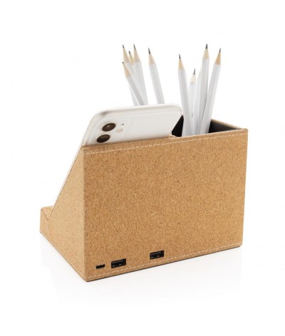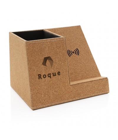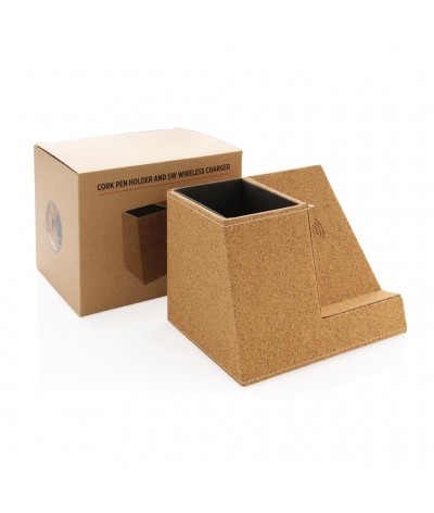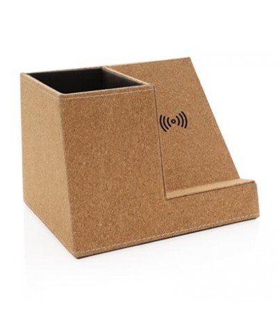 Chargeur sans fil 5W avec porte-stylo en liège naturel.