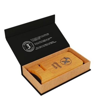 Tout est inclus : personnalisation, câble de chargement en rPET et coffret cadeau en papier recyclé avec fermeture aimantée.