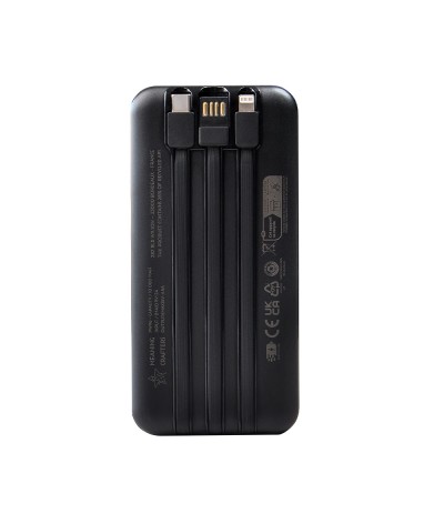 Powerbank 10 000 mAh 22,5W avec câbles intégrés 22,5 W en RPET avec logo lumineux.