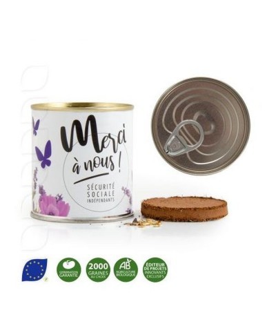 Mini boite de conserve en métal contenant le nécessaire pour faire germer fleurs, légumes ou aromates.