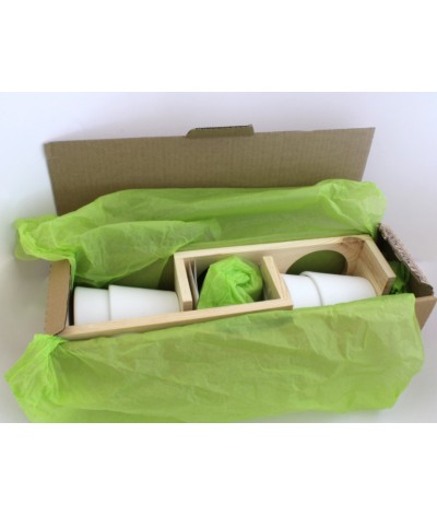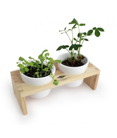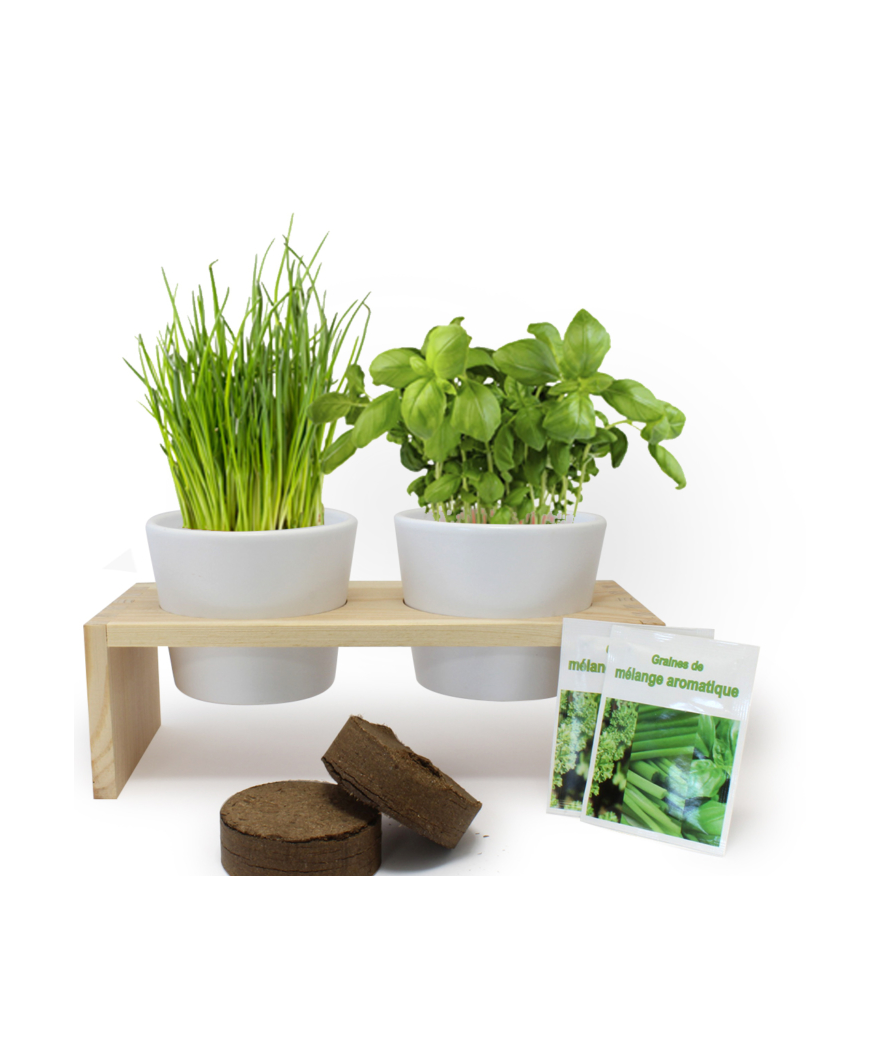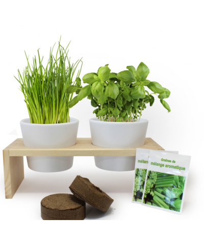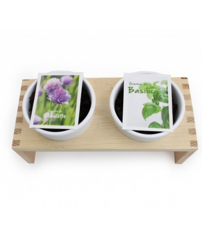 Plateau en bois naturel avec 2 pots en terre cuite contenant 2 plaquette de tourbe déshydratée et 2 sachets de graines aromatiques ou autres ( basilic et ciboulette par exemple) et un leaflet... Suite dans la description