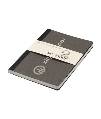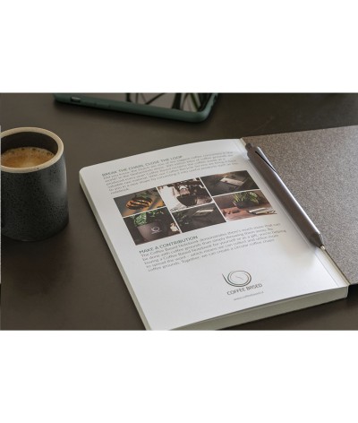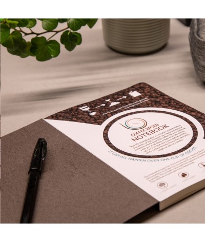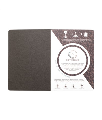 Carnet de note avec couverture biosourcée à à base de marc de café. Le papier est 100% recyclé, donc aucun arbre n'est coupé pour fabriquer ce papier et la production est aussi respectueuse... Suite dans la description