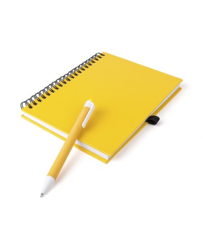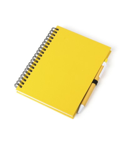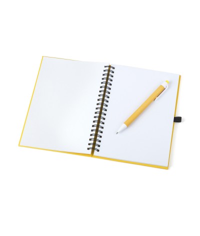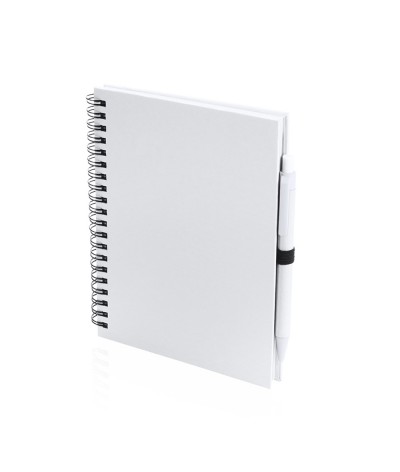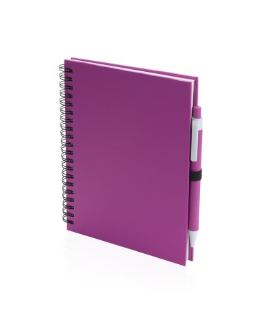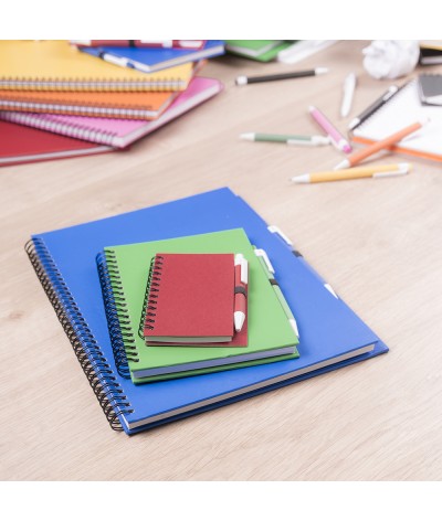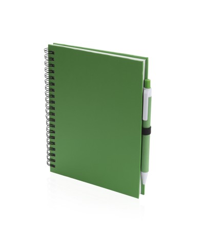 Cahier à spirales avec couverture en carton recyclé résistant et stylo à bille en carton recyclé assorti. 70 feuilles unies et avec porte-stylo au dos de la couverture.