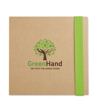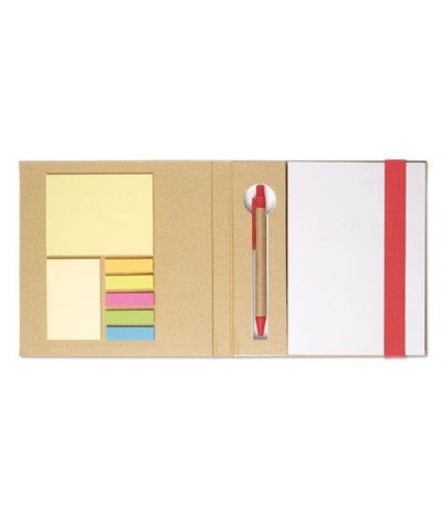 Carnet recyclé avec marqueurs repositionnables, stylo bille corps papier (encre bleue) et bloc-notes.
