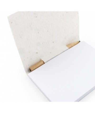 Bloc-note 100x75mm en papier recyclé et fabriqué en France. Couverture en papier à graines de fleurs mellifères 200g entièrement personnalisable avec un mini crayon inséré : crayon de bois... Suite dans la description