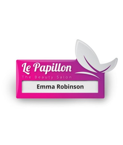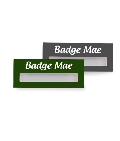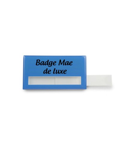 Badge à fenêtre (pour le nom) Attache épingle ou aimant. Toutes formes réalisables : ovale, rectangle, rond, carré, spéciale. Personnalisation individuelle possible.