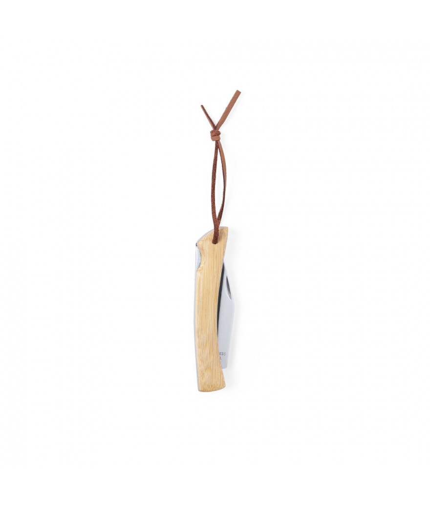 Couteau naturelle avec lame en acier inoxydable et poignée en bambou robuste avec serrure de sécurité. Avec du ruban de transport en cuir et présenté dans une boîte individuelle.
