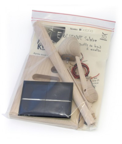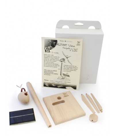Eolienne solaire en bois équipée d’un capteur solaire + moteur électrique pour faire tourner les hélices. Fabrication française. Proposée en kit de montage rapide et facile avec notice et... Suite dans la description