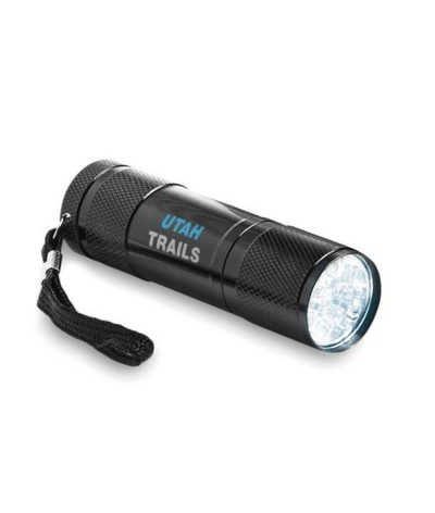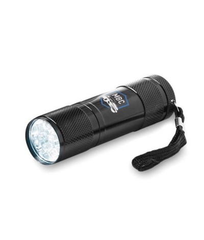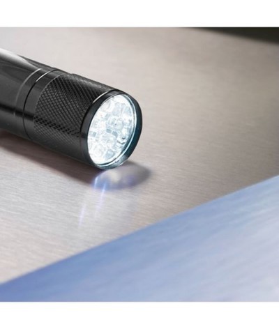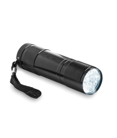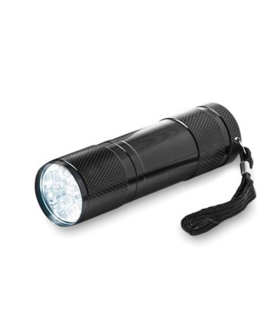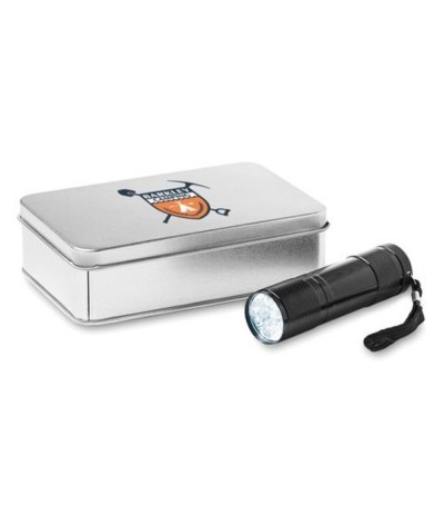 Torche aluminium 9 LED avec dragonne. Livrée avec 3 piles AAA et dragonne présentée dans une boite métallique.