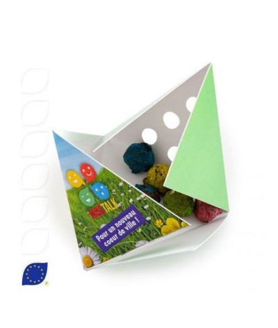 Cette petite boite sous forme de pyramide à personnaliser, renferme 3 bombes de graines naturelles ! Lancez les dans la ville, terrains abandonnés, pieds d'immeubles, pied d'arbres, et... Suite dans la description