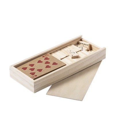 Jeu comprenant un jeu de cartes français en carton recyclé et un jeu de dominos en bois. Ensemble présenté à l´intérieur d´un coffret en bois avec des compartiments individuels pour chaque... Suite dans la description