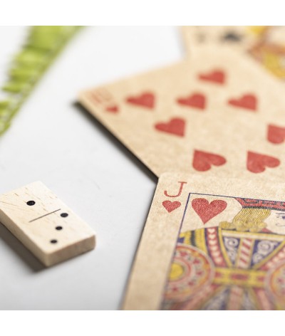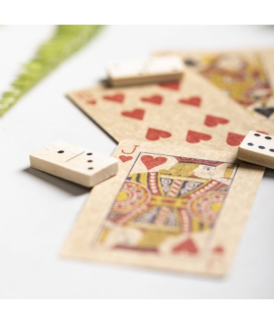 Jeu comprenant un jeu de cartes français en carton recyclé et un jeu de dominos en bois.
