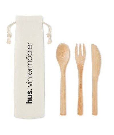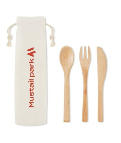 Couverts en bambou réutilisables dans une pochette en toile. Comprend un couteau, une fourchette et une cuillère.