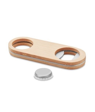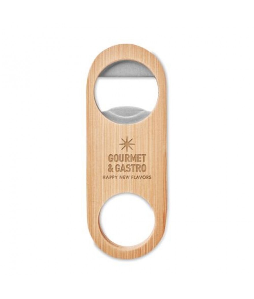 Décapsuleur en acier inoxydable avec surface en bambou. Le bambou est un produit naturel, il peut y avoir de légères variations de couleur et de taille par article.