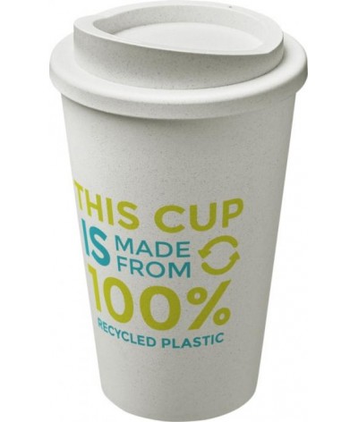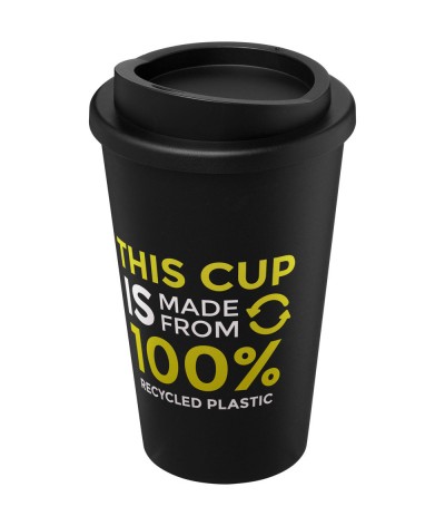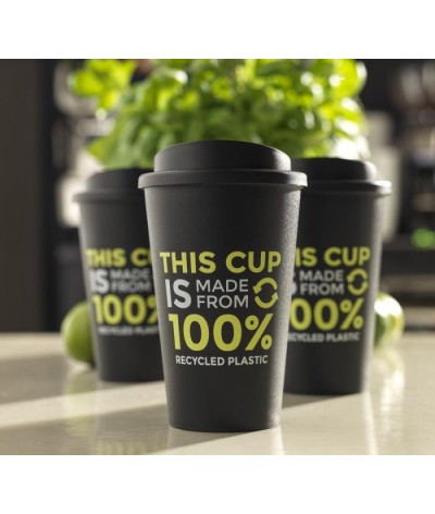 Gobelet isotherme à double paroi avec couvercle à visser. Capacité de 350 ml. Fabriqué en matériaux 100 % recyclés. La nuance de noir peut varier en fonction de la nature du matériau recyclé.
