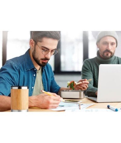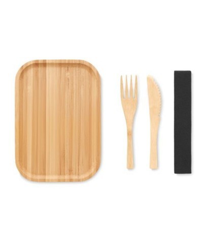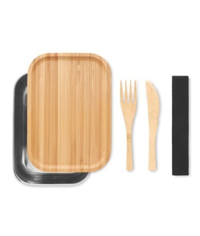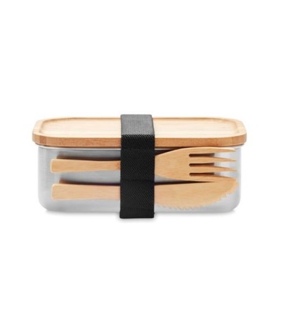 Lunch box en acier inoxydable avec couvercle en bambou et 2 couverts.