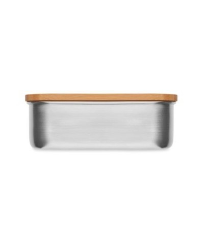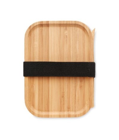 Lunch box en acier inoxydable avec couvercle en bambou et 2 couverts. Bande élastique en polyester. Contenance 600 ml. Le bambou est un produit naturel, il peut y avoir des variations de couleur et... Suite dans la description