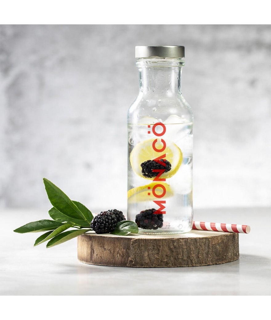 Bouteille carafe 785 ml en verre avec bouchon à vis en métal. Fabriqué en Europe et présenté dans une boîte en carton recyclé avec le badge Made in Europe.