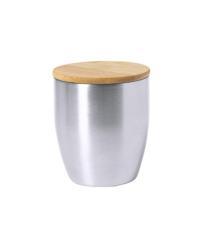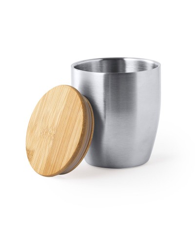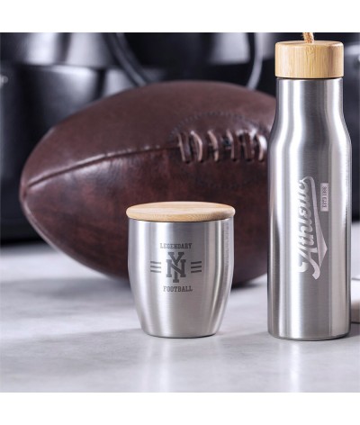 Mug verre en acier inoxydable et bambou, double paroi avec un design incurvé attrayant et présenté dans une boîte design kraft individuelle.