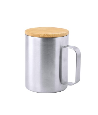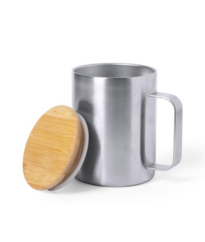 Mug isotherme en acier inoxydable et bambou, chaud et froid d'une capacité de 350 ml.