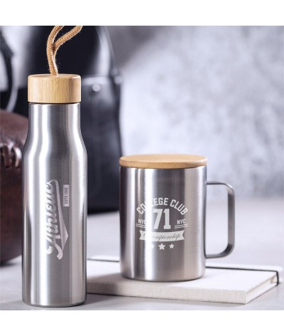 Mug isotherme en acier inoxydable et bambou, chaud et froid d'une capacité de 350 ml. Couvercle en bambou et présenté dans une jolie boîte éco design