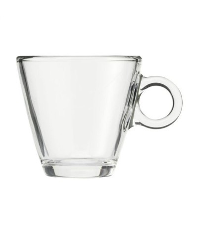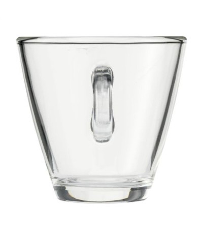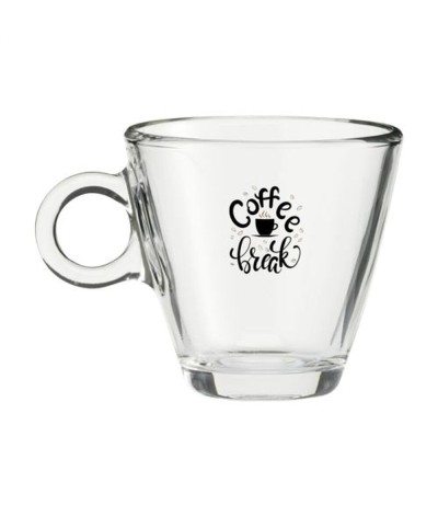 Tasse café en verre trempé de haute qualité. Modèle intemporel avec une belle anse ronde. Convient pour le café et le cappuccino. Capacité 230 ml. Fabriqué en Italie. Marquages : Tampographie... Suite dans la description
