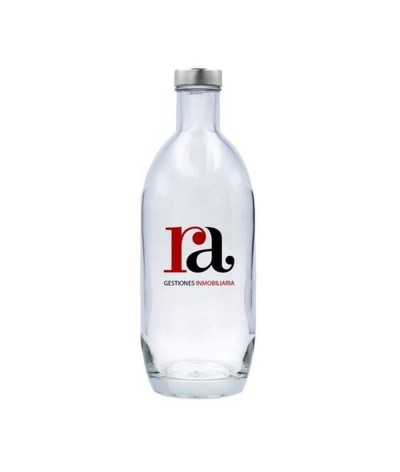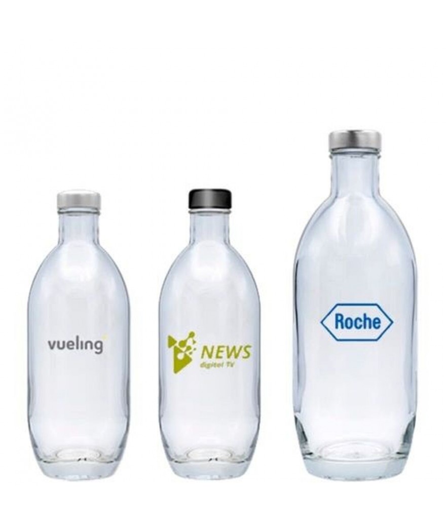 Bouteille en verre personnalisée. Bouchon argenté. Impression 2 couleurs, disponibles en 370ml ou 700ml.