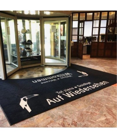 Tapis de sol personnalisé avec logo ou une illustration imprimée numériquement sur un tapis en PET écologique. Choisissez parmi 66 options de couleur standard. 900gr/m² et bords extra renforcer.