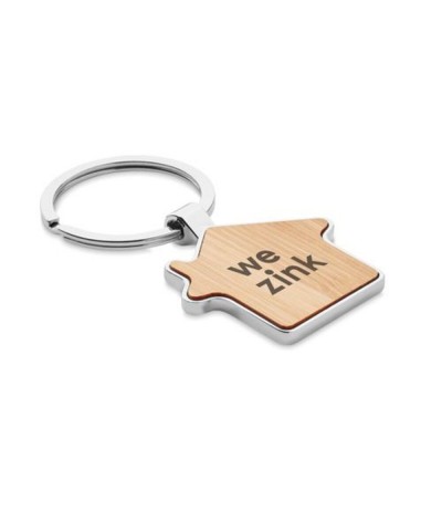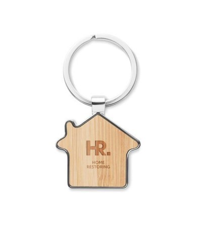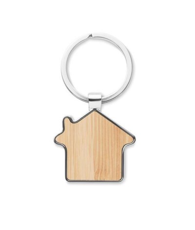 Porte-clés en alliage de zinc en forme de maison avec surface en bambou. Le bambou est un produit naturel, il peut y avoir de légères variations de couleur et de taille par article.