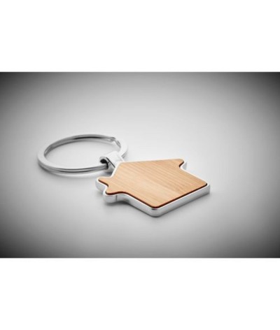 Porte-clés en alliage de zinc en forme de maison avec surface en bambou.