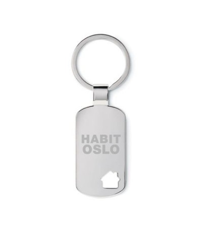 Porte-clés en métal avec détail maison dans un coin. Présenté dans une boîte noire.