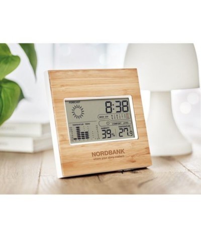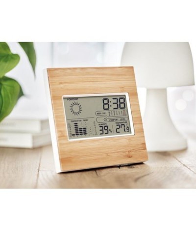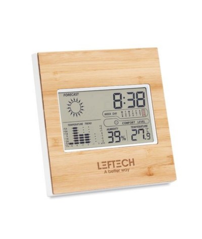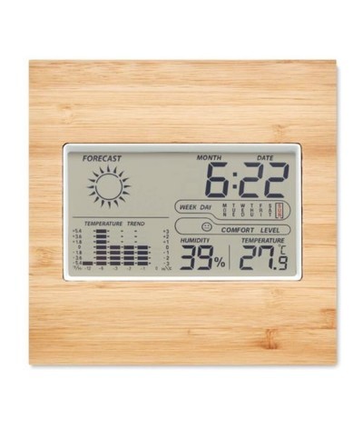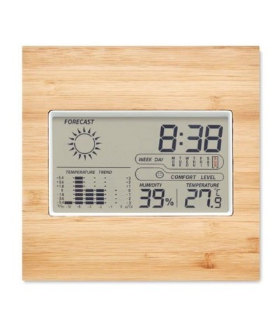 Station météo multifonction finition bambou. Comprend une horloge, un affichage de la température, de l'humidité et un calendrier. 2 piles AAA non incluses.