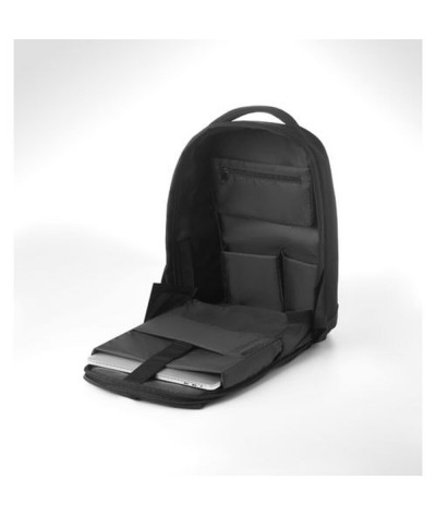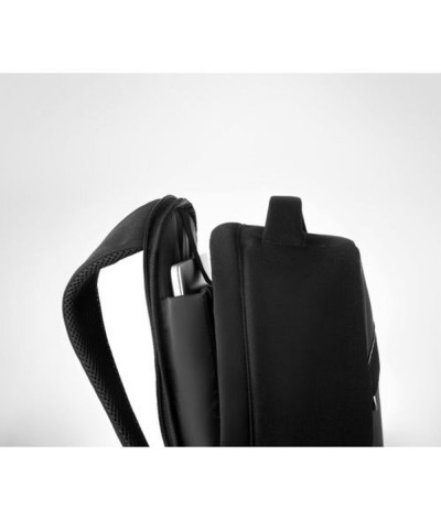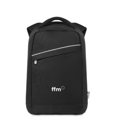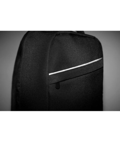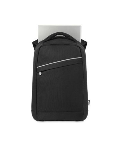 Sac à dos en rPET 600D avec bandoulière et dos rembourrés. Avec compartiment interne rembourré pour ordinateur portable 13 pouces. Fermeture éclair au dos pour plus de sécurité.