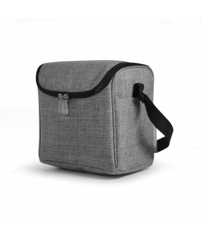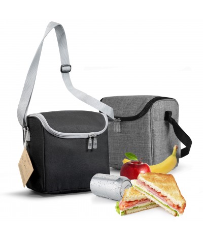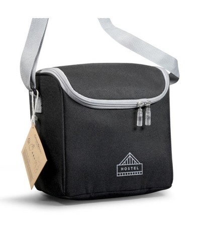 Sac lunch isotherme avec 3 couverts en bambou inclus. 1 poche côté plaquée / 1 poche mesh intérieur, bandoulière ajustable, Fabrication 100% PET recyclé (rPET) et feuille d'aluminium,... Suite dans la description