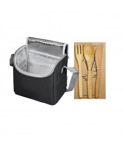 Sac lunch isotherme avec 3 couverts en bambou inclus.