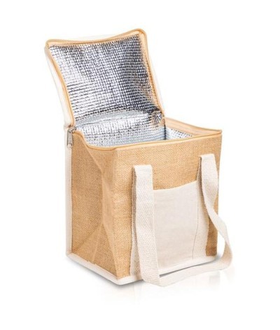 Sac isotherme en jute avec une poche extérieure en coton pour une impression facile. Intérieur en aluminium avec isolation 2 mm.