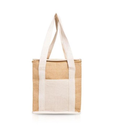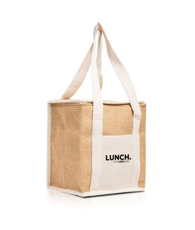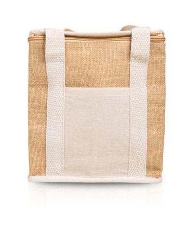 Sac isotherme en jute avec une poche extérieure en coton pour une impression facile.