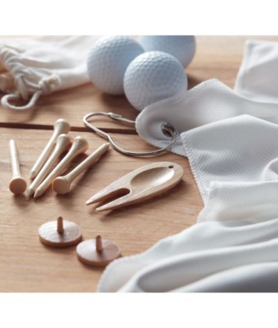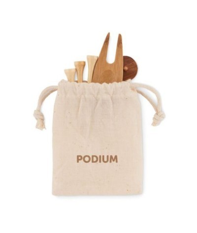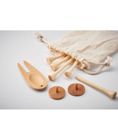 Accessoires de golf en bambou comprenant 6 tees de golf, 1 relève pitch et 2 marque balles de golf en bois, le tout présenté dans un sac à cordon en coton biologique.