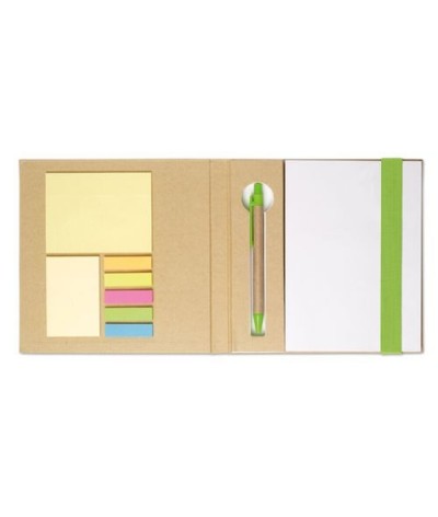 Carnet recyclé avec marqueurs repositionnables, stylo bille corps papier (encre bleue) et bloc-notes.