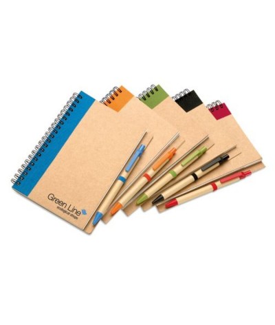Bloc de 70 pages papier blanc recyclé et un stylo bille en carton recyclé et plastique biodégradable. Encre bleue.