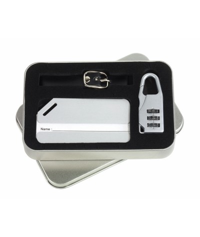 Accessoires de voyage composé d´une étiquette à bagages modulable pour l´adresse avec sangle et d´un cadenas à chiffres avec mousqueton..