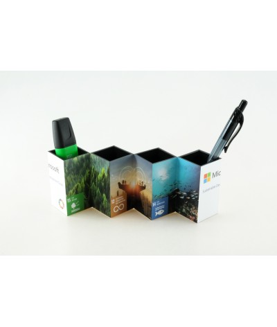 Ajoutez du fun à votre communication de bureau ! Un surprenant pot à crayons en forme de cube qui, une fois déplié, se transforme en panneau d'affichage panoramique puis en cube à nouveau !... Suite dans la description