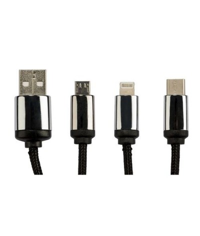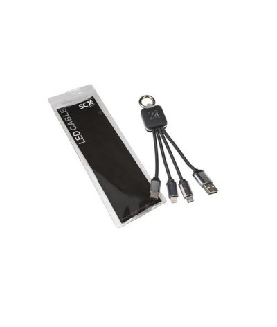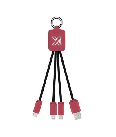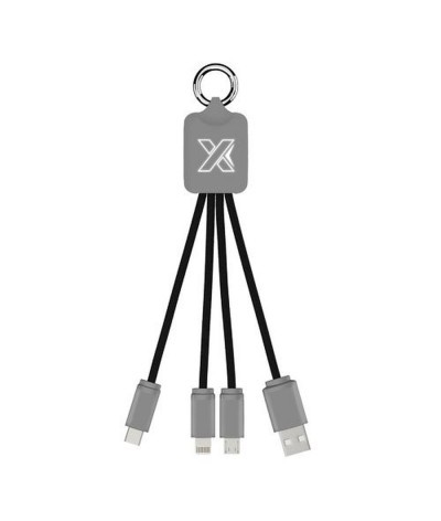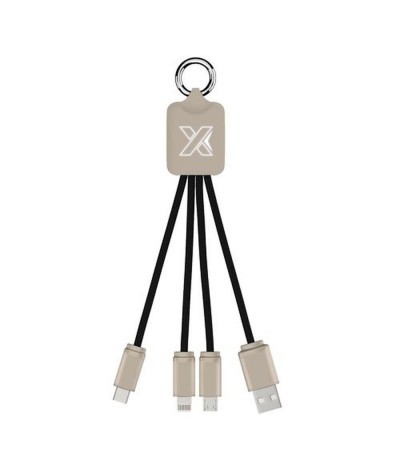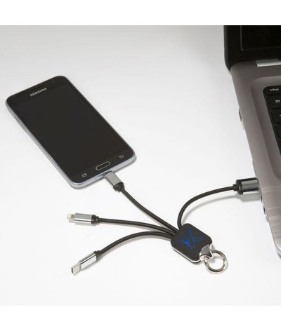 Câble carré avec double logo lumineux recto/verso pour type C, iPhone et Android et cordons en rPET (plastique issus de bouteilles recyclées).