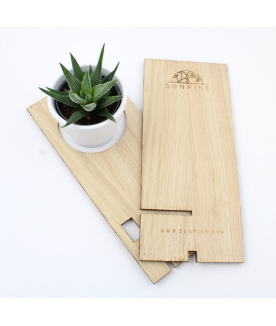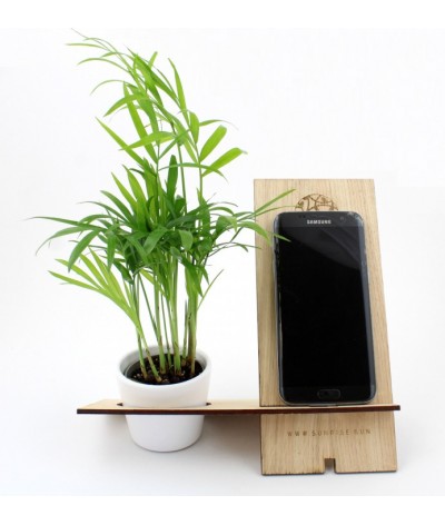 Support bois en Chêne ou en Pin. Contient un pot céramique, une plante dépolluante Haworthia ou palmier et une notice. La notice permettra d’assembler les éléments très facilement.