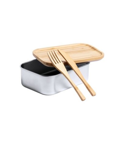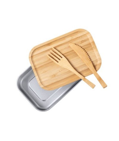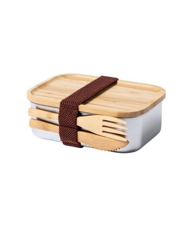 Lunch box en acier inoxydable avec couvercle en bambou naturel. Avec set de couverts en bambou (couteau et fourchette) et sangle élastique, contenance 600 ml.